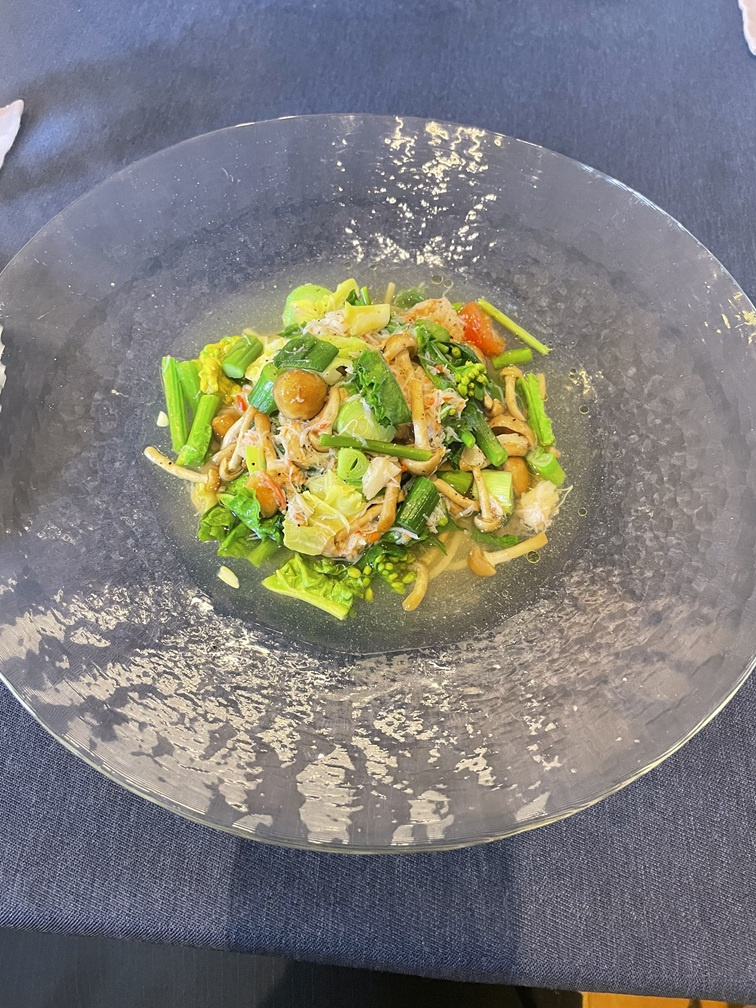 本ズワイガニのスープパスタ。麺を少な目でお願いしましたが、春野菜たっぷりで充分な量です。いろどりが最高です。